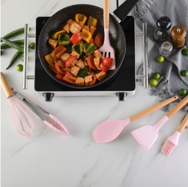 Chất liệu: silicone lành mạnh và thân thiện với môi trường; Tay cầm bằng gỗ: nhẹ, bền và thoải mái khi sử dụng